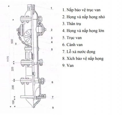 Trụ cứu hoả bao gồm các bộ phận chính sau: thân van, cánh van, trục van, cửa lấy nước , nắp đậy và đế.
