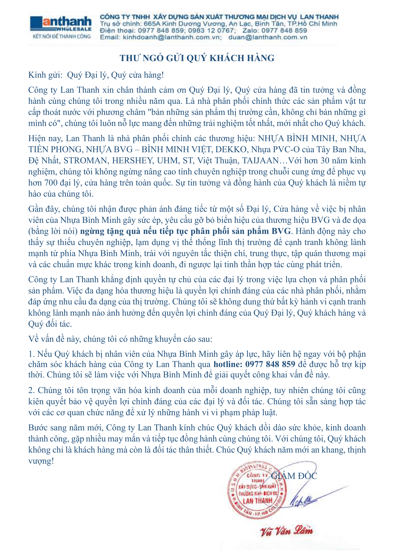 THƯ NGỎ GỬI QUÝ KHÁCH HÀNG