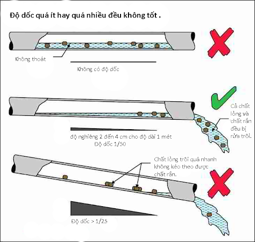 - Độ dốc của đường ống thoát ngang: việc không tuân thủ đúng độ dốc của đường ống thoát nước ngang là một trong những lý do chính dẫn đến hệ thống thoát nước bị nghẹt. Ngoài ra, trong trường hợp đường ống có độ dốc quá lớn thì chất lỏng chảy với tốc độ quá nhanh và không cuốn theo được chất rắn có trong nước thải, khiến chất rắn ngày một tích tụ lại trong đường ống gây tắc nghẹt. Độ dốc của đường ống thoát nước bẩn (nước thải) và nước mưa cần phải tuân theo chỉ dẫn của thiết kế. Khi không có chỉ dẫn thì độ dốc cho phép đối với hệ thống thoát nước sinh hoạt được quy định như sau: