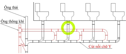 - Sử dụng cút nối chữ Y cho các điểm kết nối giữa đường ống dọc xuống trục thoát nước ngang: việc sử dụng cút nối chữ Y đảm bảo dòng chảy của nước thải đi theo một hướng, giúp thoát nước hiệu quả hơn đặc biệt đối với thoát nước bồn cầu như hình mình họa bên dưới: